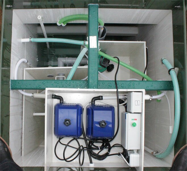 Ориентирована на ежесуточную переработку стока не превышающую 1,6 метра кубических в сутки, что эквивалентно восьми пользователям. Максимальный пиковый сброс хозяйственно-бытовых сточных вод в приемную камеру очистного сооружения рассчитан на 440 литров и будет полностью переработан ориентировочно в течение 2-х часов. Это говорит о том, что при неправильном подборе станции очистки, вода на выходе скорее всего не будет соответствовать заявленным в сопроводительных документах показателям, а так же, может иметь неприятный запах и окрашенный цвет. Септик оборудован емкостью для аккумуляции очищенной воды внутри и дренажным насосом, осуществляющим принудительный сброс по мере накопления в специальную водоотводящую канаву или дренажную систему. Канализационная труба при входе в аэрационную станцию должна залегать не глубже 85 см от уровня земли. Как и прежде на поверхности мы будем наблюдать компактную крышку зеленого цвета для контроля работоспособности и регламентных сервисных мероприятий указанных в техническом паспорте на продукцию. При принятии решения по установке данной модификации есть возможность установить ванну небольших размеров или две душевые кабины.